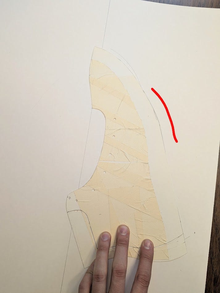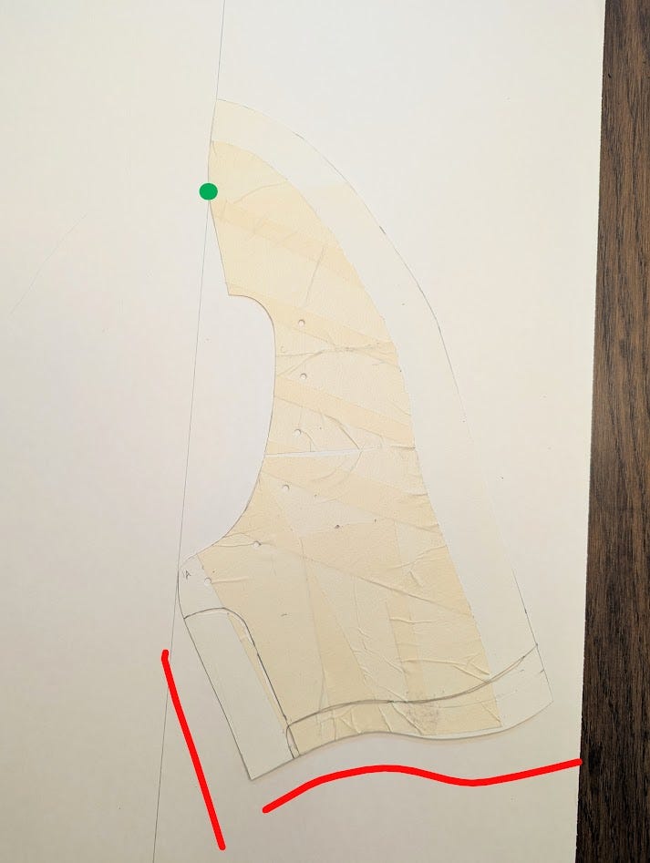 This part is a little hand-wavy. I lined up point B and angled the pattern base a bit, about 1 cm or so, then drew out the red line. You can add a bit extra to the lasting allowance later if you are worried about not giving yourself enough space with this maneuver.