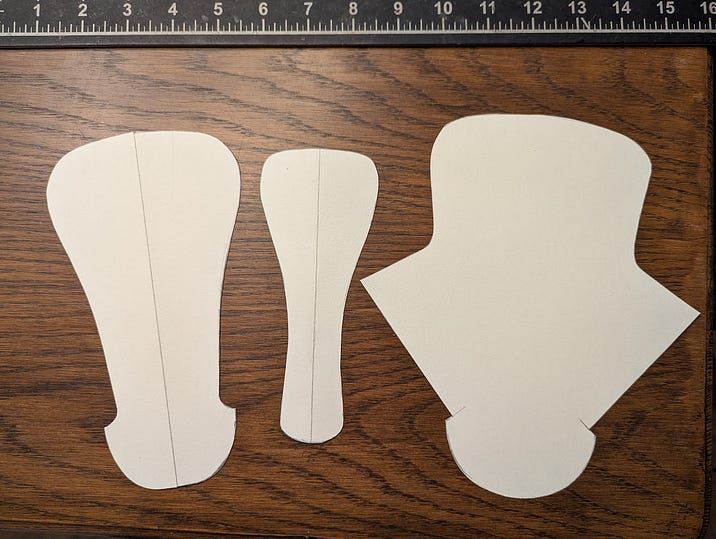 Here are the remaining pattern pieces. Top is the heel strip, middle is the padded collar, bottom is the padding for the collar. I just flipped the collar from my pattern base along a center line and added a lasting allowance.