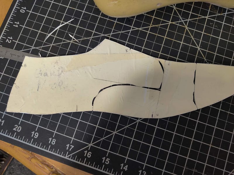 I added a heel counter some lacing holes, and marked where my lining is going to be. At this stage, if you want a normal tongue, just extend the C line and add a tongue (reference the Derby pattern guide for more details).