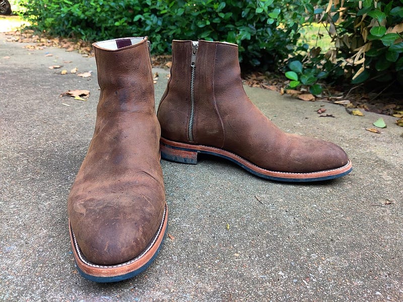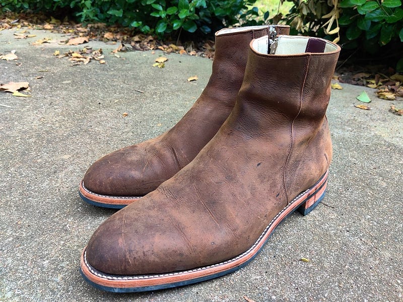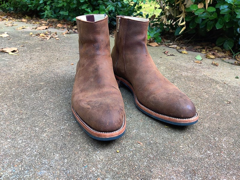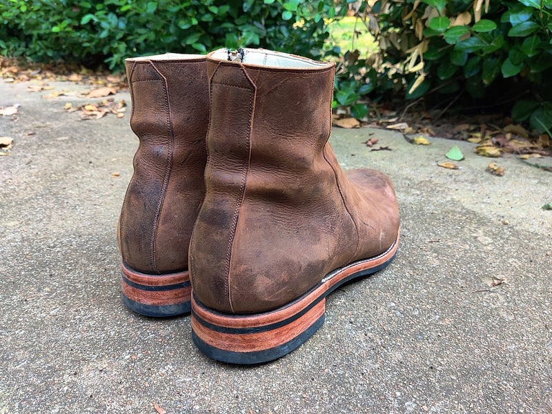 And after a few weeks of pretty heavy wear. The beauty of this leather is that you can apply some conditioner, most of the scuffs will disappear, or you can leave it for a more worn look. It also burnishes really well for some great patina action, you can see some starting to develop along the front. Its a heavily waxed nubuck Kudu from CF Stead, a tannery in the UK. Its one of my favorite leathers of all time, besides the patina potential, its quite thick and dense, but still maintains its softness and flexibility.