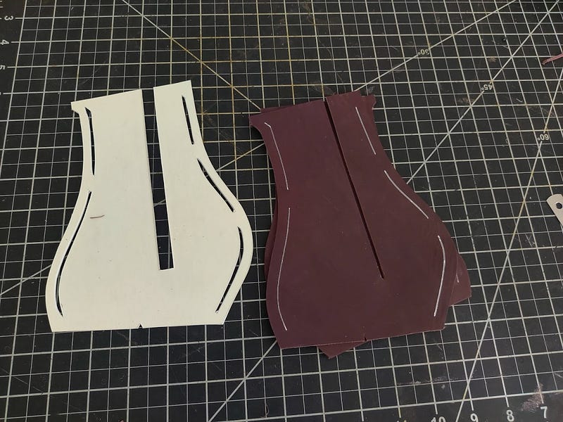 Here is the complete pattern base. I make my cuts straight along the lines, and wavy around it, so that I can tell which side to trace along. I also go ahead and punch out the eyelets with the exact size they’re going to end up being. That way I can measure it all out exactly and not eyeball it later, which leads to misaligned eyelets.
