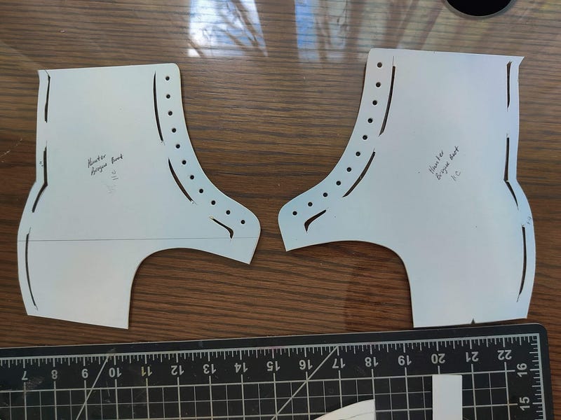 And here is the vamp pattern, along with two examples of crimp boards. I made the wooden crimp board to account for the curve of this pattern. Although, I made the prior pair of boots on the top crimp board. At first I thought the throat of the shoe was a little bit tight, which is why I made the second crimp board. However, they’ve stretched out and are perfect now so maybe I didn’t need it.