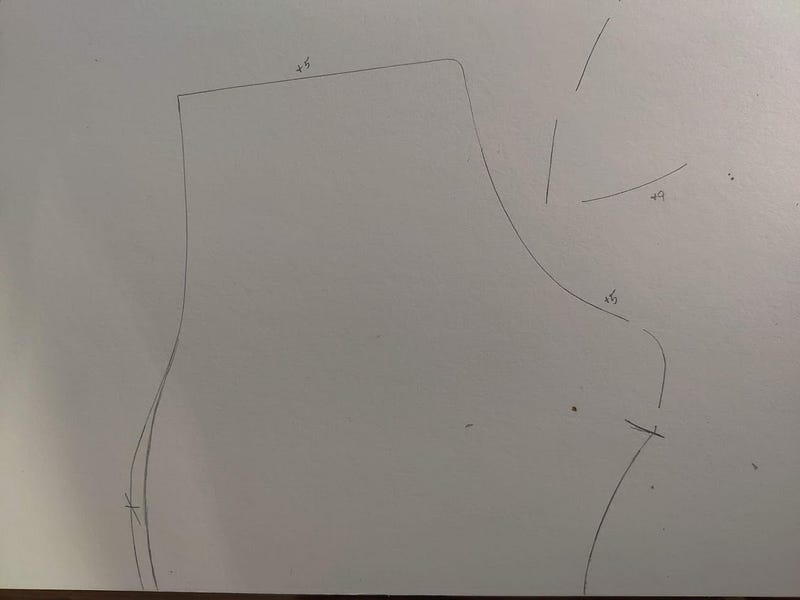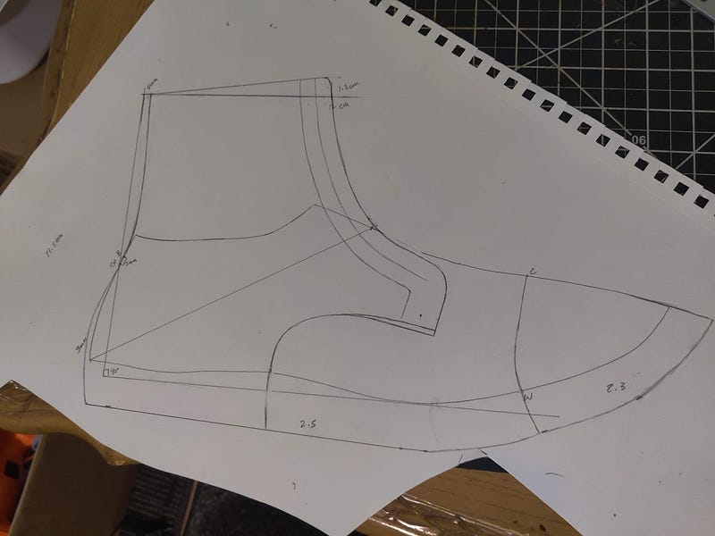 This is where you get to choose the height of your boot. Whatever you pick, extend the vertical line to that height. Draw a perpendicular line across the boot. Mark along that horizontal line how wide you want the boots. I noticed around 12–13 cm is a good width for sizes 10–11 US, the first pair of boots I made, it was almost 14 cm and way too wide for my calves.
